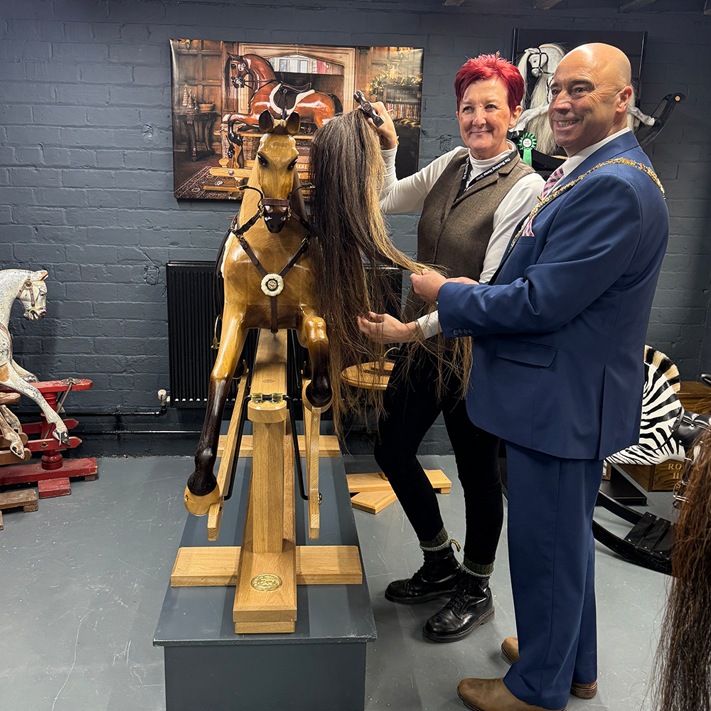 Following the ribbon-cutting, our guests were invited on a guided tour of the workshops. Here, the true heart of the business could be seen, skilled craftspeople carving, assembling and finishing each horse by hand. The Chairman met members of the team and gained insight into the meticulous processes involved — from shaping solid timber forms to applying traditional gesso finishes and hand-painted detailing.One of the highlights of the visit was the opportunity for Mr Dealtry to try his hand at “tacking up” a horse under Julie’s expert guidance — fitting the bridle, saddle and traditional tack that give each rocking horse its distinctive character. Laughter and encouragement from the workshop floor added to the celebratory atmosphere, demonstrating the warmth and camaraderie that underpin the business.