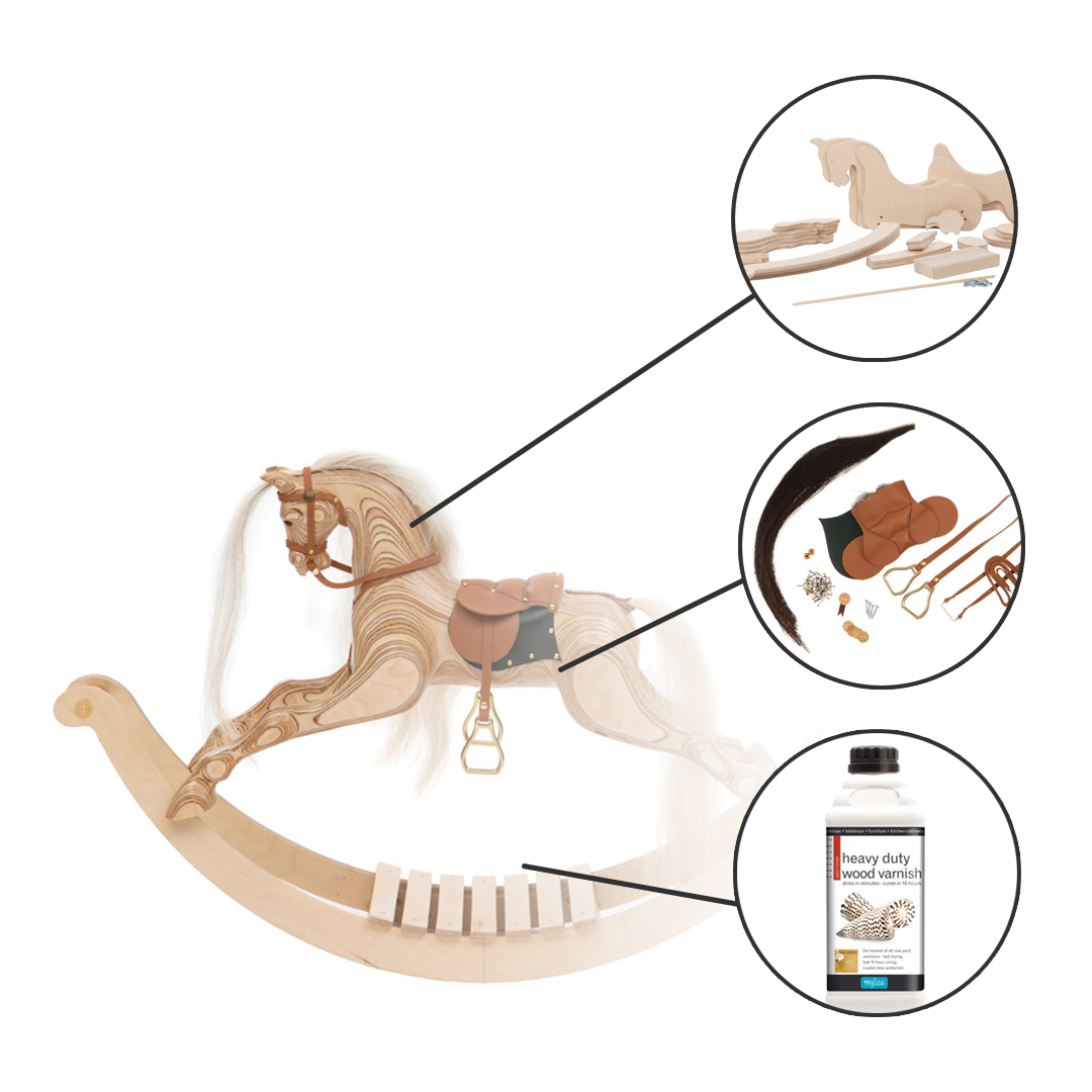 This is not a pre-carved kit, but the preparation is done for you so you can start assembly straightaway, the interesting bit! All plywood parts for the horse are CNC cut and drilled. Contains all parts of horse and bow rockers, precision machined from 3/8" (9mm) quality birch plywood, with all location dowel holes pre-drilled, including location dowel. Includes step-by-step fully illustrated instruction booklet.