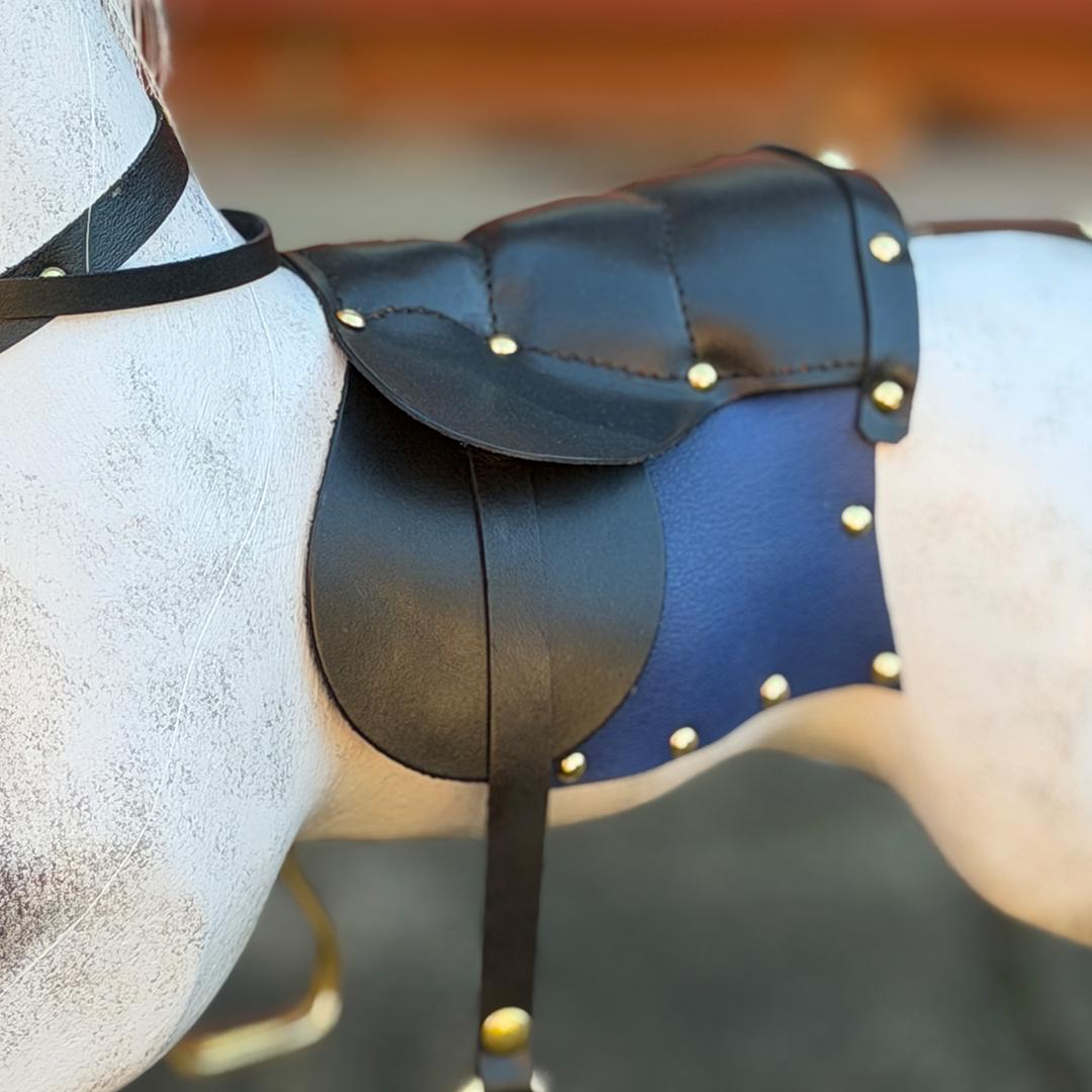 Beautiful decorative light grey Dapple Grey Rocking Horse on Bow Rockers. Fitted with black accessories, blue saddlecloths and detailing.